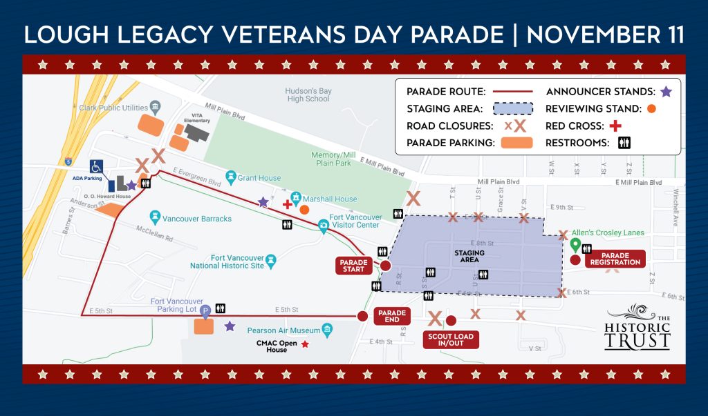 The parade route begins at Evergreen Blvd. & E. Reserve Street (east end of Officers Row) and winds through the Fort Vancouver National Site, ending near Pearson Air Museum.